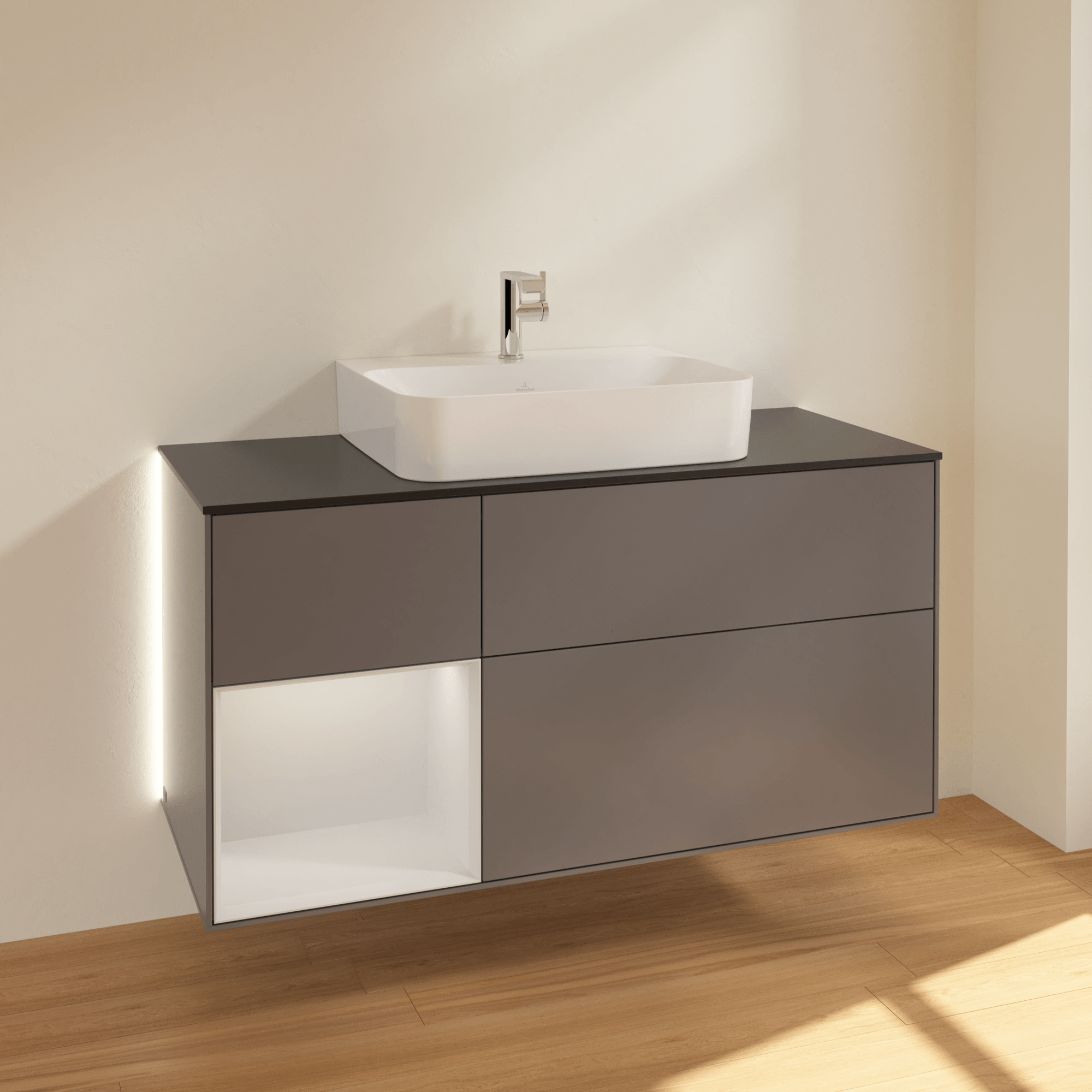 Villeroy & Boch 福朗 梳洗柜, 含照明, 3 个拉出式隔室, 1200 x 603 x 501 mm, 哑光烟灰色烤漆 / 白色亮面漆