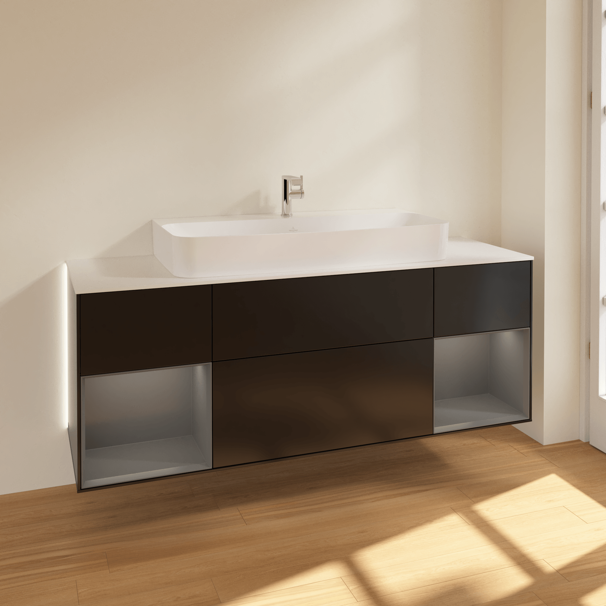 Villeroy & Boch 福朗 梳洗柜, 含照明, 4 个拉出式隔室, 1600 x 603 x 501 mm, 黑色哑光漆 / 哑光烟灰色烤漆